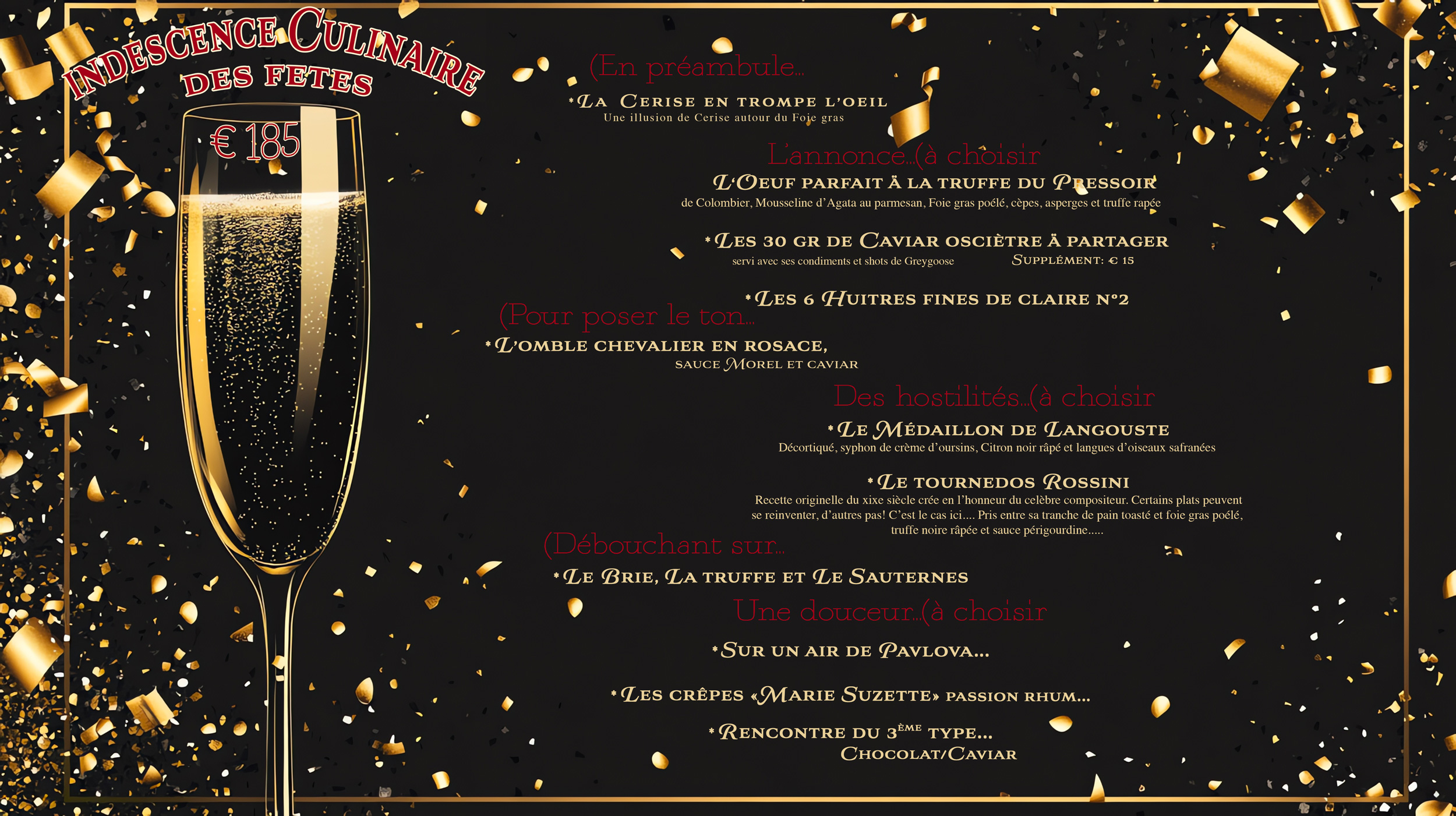 Pour célébrer la magie des fêtes de fin d’année, Le chef Droingt vous a concocté un menu exceptionnel qui éveillera vos papilles et fera briller vos yeux ! 6 services autour des produits les plus nobles: Caviar Oscietre, Melanosporum (truffe noire française), langouste, sole sauvage, coeur de filet angus bio pour une soirée inoubliable en notre compagnie ✨